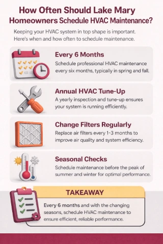 Regular HVAC maintenance is essential for keeping your home comfortable and your system running efficiently. For Lake Mary homeowners, the ideal schedule is at least twice a year—typically once in the spring before cooling season and once in the fall before heating season.